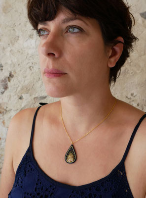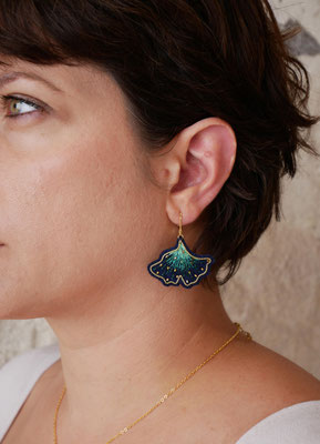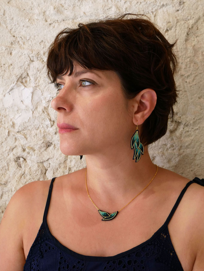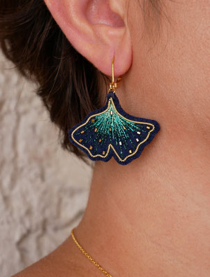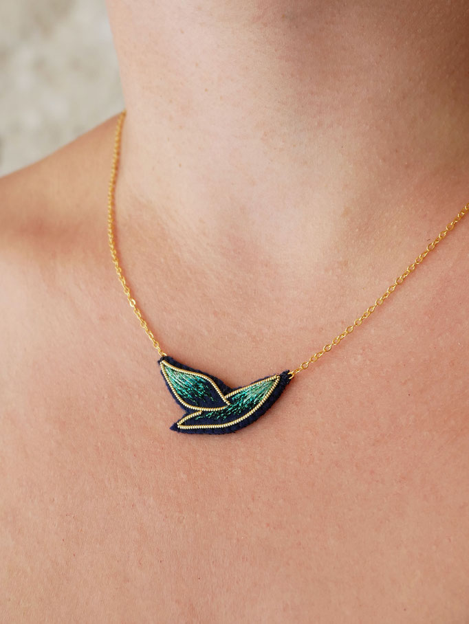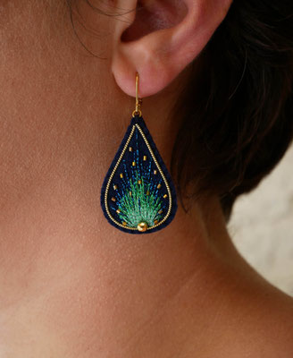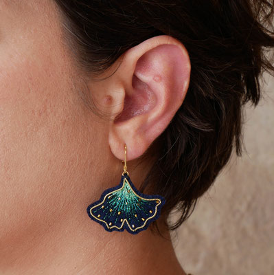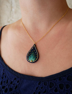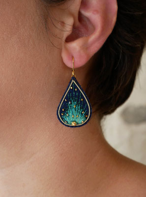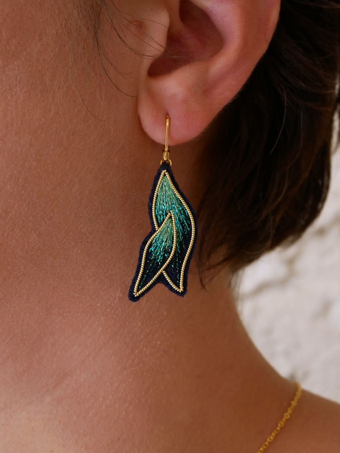 Le biotope de Maison Abel se décline en un graphisme délicat et lumineux. Sur son métier, broderie d’or, perles et fils de soie révèlent les trésors d’un cabinet de curiosités. Ces bijoux brodés à la main capturent les bribes d’un monde singulier, que Belinda encadre de fils d’or.