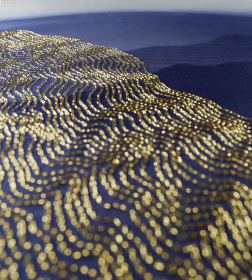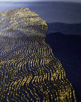 Broderie au fil d’or sur organza de soie, peinture sur soie
